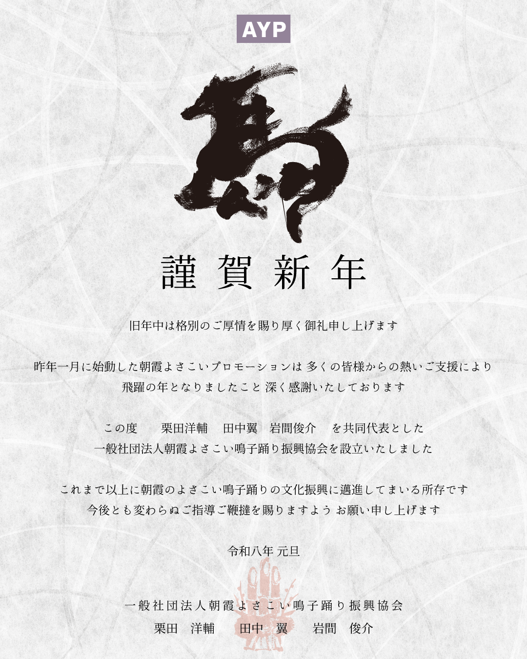 昨年一月に始動した朝霞よさこいプロモーションは 多くの皆様からの熱いご支援により飛躍の年となりましたこと 深く感謝いたしております